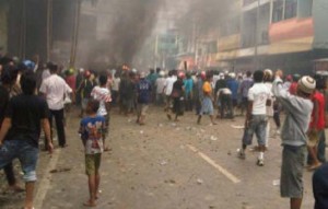 Lebih dari 11 kendaraan roda dua dibakar dan korban luka-luka diperkirakan mencapai puluhan orang.