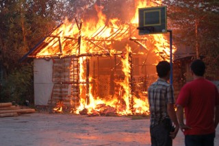 Penghadangan bukan hanya dilakukan oleh para warga tapi juga dengan adanya palang kayu dan bakaran ban bekas di tengah jalan pintu masuk gerbang Rumdis.