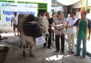 UNTUK SESAMA - Direktur Kepatuhan Bank Mutiara Erwin Prasetio (baju batik) menyerahkan sapi untuk kurban pada pengurus Masjid Assalafiyatulhuda Jalan Kertajaya Surabaya, Jumat (26/10/2012).