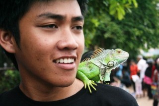 Cecep begitu tenang bertengger di pundak Joko Saputro (20). Cecep terlihat sangar dengan duri di punggung dan janggutnya. Lima jemarinya juga mempunyai kuku untuk mencengkeram baju Joko.