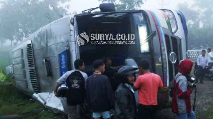 Kecelakaan tunggal diduga akibat aksi ugal-ugalan sopir bus Sumber Selamat bernopol W 7036 UZ.