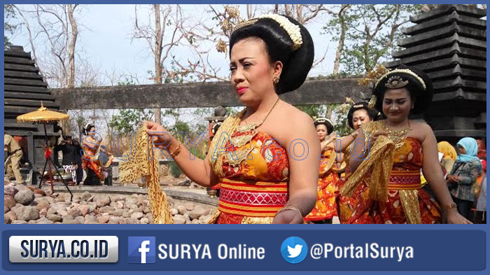 SURYA.co.id | BOJONEGORO - Tiga belas waranggana tayub manampilkan tarian gambyong sambil mengelilingi tungku Kahyangan Api Desa Sendangharjo Kecamatan Ngasem, Kabupaten Bojonegoro, Senin (19/10/2015) siang. Masing-masing waranggana menebar bunga ke dalam tungku.