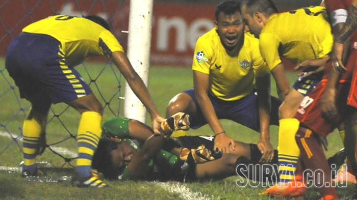 Aji Saka, kejang, tak sadarkan diri, dan dari hidungnya mengeluarkan darah setelah mebentur keras tiang gawang, saat timnya menjamu Arema FC di Stadion Petrokimia Gresik, Rabu (12/7/2017) malam.