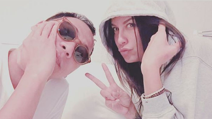 Keduanya kompak sedang mengenakanmasker wajah berwarna putih.