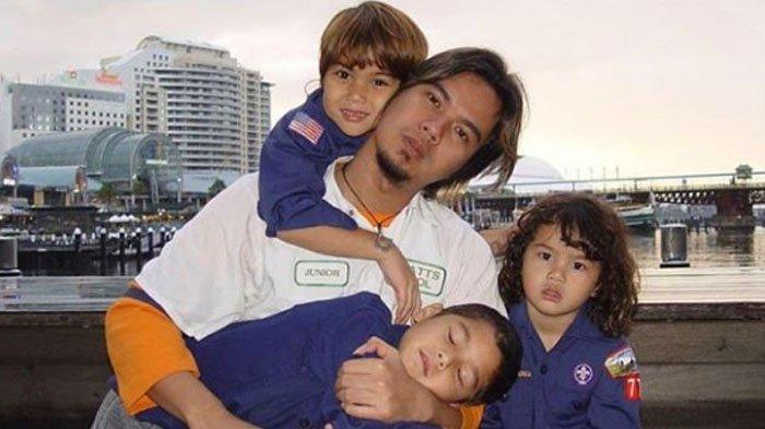 Al tampak terlelap di tangan Ahmad Dhani, sementara kedua adiknya tersenyum sumringah.