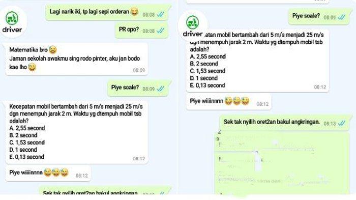 SURYA.co.id - Isi chat whatsapp (WA) driver ojek online (ojol) yang membantu temannya mengerjakan soal matematika, viral di media sosial Twitter