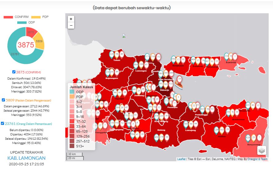 Hingga Selasa (26/5/2020) pagi, jumlah kasus positif COVID-19 di Jatim mencapai 3875 kasus seperti dilansir dari www.infocovid19.jatimprov.go.id.