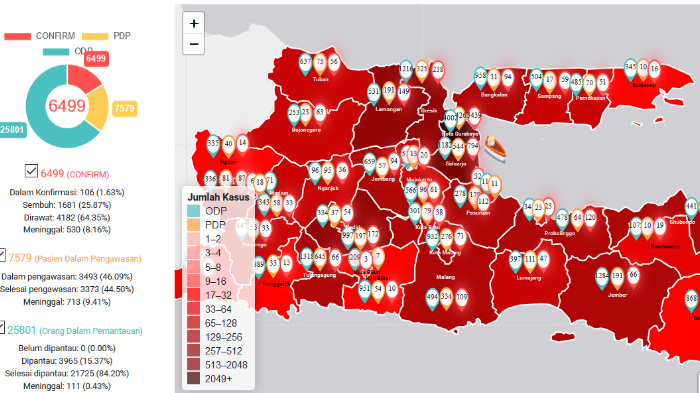 Data tersebut diambil dari situs infocovid19.jatimprov.go.id, Selasa. Dari data di sana diketahui kalau jumlah total kasus Covid-19 di Jatim saat ini mencapai 6.499 kasus.