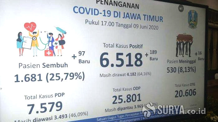 SURYA.CO.ID | SURABAYA - Per Selasa (9/6/2020), ada tambahan 189 pasien positif virus Corona atau Covid-19 baru di Jawa Timur, 79 kasus berasal dari Kota Surabaya. Total, per 9 Juni 2020 di Jawa Timur ada 6.518 kasus Covid-19.