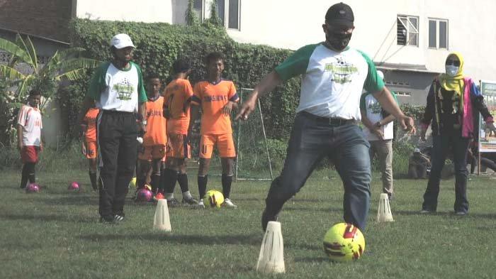SURYA.co.id | SIDOARJO - Pemandangan berbeda terlihat di sela latihan sepak bola klub Tunas Jaya di lapangan Sepande, Kecamatan Candi, Sidoarjo, Minggu (12/7/2020).