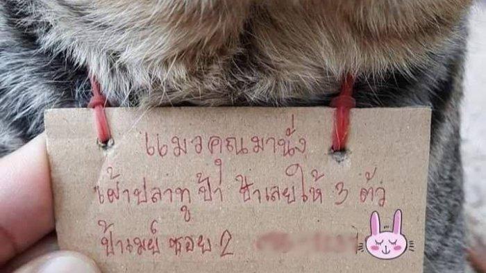Namun setelah diperhatikan, terdapat sebuah pesan yang ditulis pada secarik kertas dan dikalungkan di leher kucing tersebut.