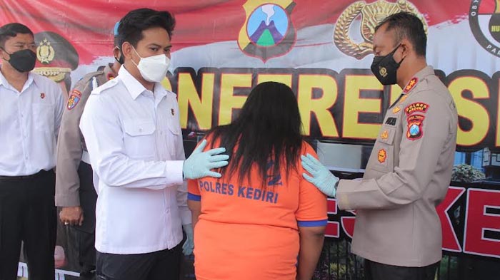 SURYA.CO.ID, KEDIRI - NNF (23) remaja perempuan asal Desa Rembang, Kecamatan Ngadiluwih, Kabupaten Kediri, hanya bisa tertunduk lesu di Mapolres Kediri, Senin (11/10/2021).
