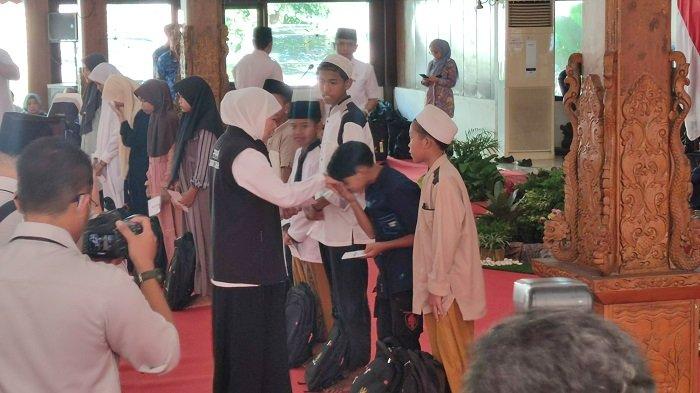 Selain itu, Gubernur Khofifah juga menyerahkan santunan kepada ratusan anak yatim piatu berupa uang tunai dan paket tas sekolah.