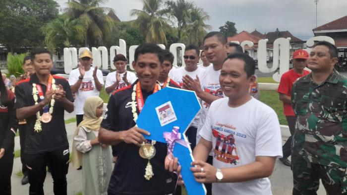 SURYA.CO.ID, LUMAJANG - Peraih medali emas Sea Games 2023 cabang olahraga MTB Cross Country Zaenal Fanani dan Feri Yudoyono mendapatkan hadiah 1 unit rumah dari Pemerintah Kabupaten Lumajang.