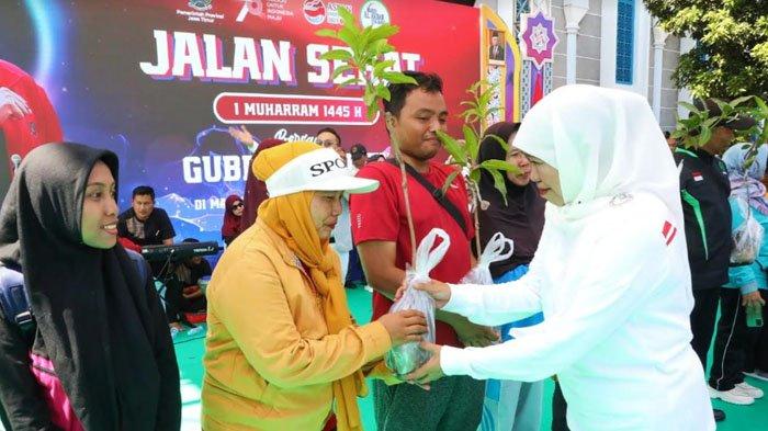 SURYA.CO.ID, SURABAYA - Gubernur Jawa Timur Khofifah Indar Parawansa membagikan 1.445 bibit pohon secara gratis pada masyarakat dalam gelaran Jalan Sehat 1 Muharram 1445 H di halaman Masjid Nasional Al-Akbar Surabaya (MAS), Rabu (19/7/2023).