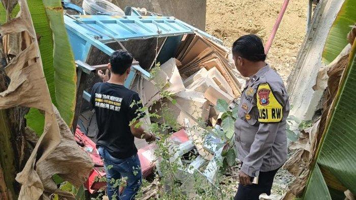 Bersamaan itu, truk Hino yang bermuatan beton sarana penerangan jalan seberat 8 ton saat melintas turut terbawa terjun ke dasar sungai