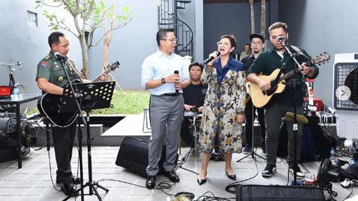 Jenderal Agus tampak begitu mahir memainkan gitar, mengiringi Nurul Arifin bernyanyi.
