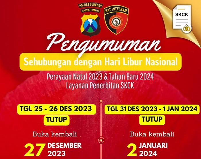 Dalam stiker resmi tersebut disampaikan, bahwa pengumuman sehubungan dengan hari libur nasional perayaan Natal 2023 dan Tahun baru 2024 layanan penerbitan SKCK ditutup mukai tanggal 25 - 26 Desember 2023.
