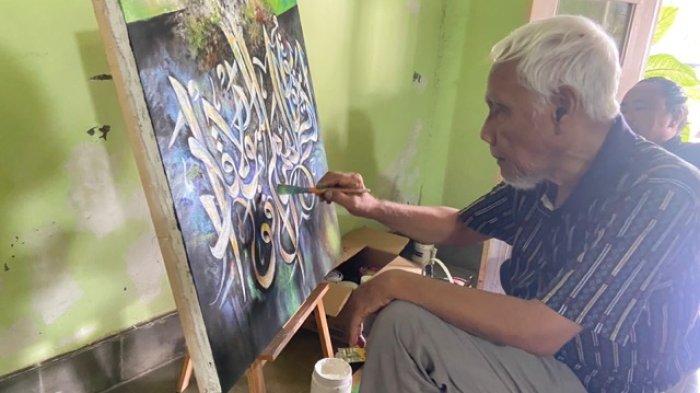 Dengan telaten pria berusia 60 an tahun ini tangannya menggoreskan di kanvas. Membentuk sebuah ayat Al Quran.