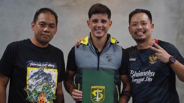 Bruno memegang map berlogo Persebaya, sebagai tanda baru saja selesai menandatangani kontrak.