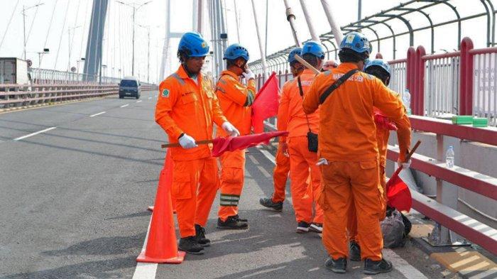 SURYA.co.id | SURABAYA - PLN Unit Induk Transmisi Jawa Bagian Timur dan Bali (UIT JBM) menggelar Simulasi Tanggap Darurat Pengamanan Saluran Kabel Tegangan Tinggi (SKTT) yang membentang di sepanjang Jembatan Suramadu, Kamis (19/6/2025).