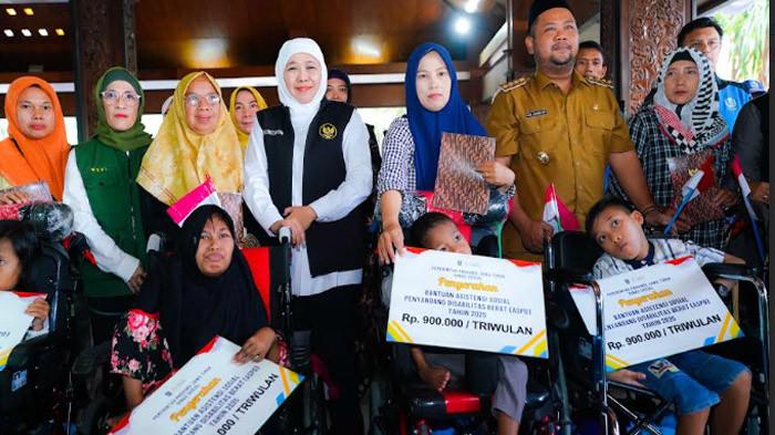 Dalam penyerahan itu, Gubernur Jawa Timur Khofifah Indar Parawansa berpesan agar bansos yang diterima tidak digunakan untuk judi online.