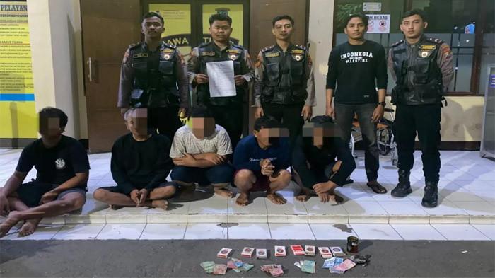 Personel Sat Samapta Polrestabes Surabaya membubarkan lima orang yang tengah asyik bermain judi di sebuah gardu di Jalan Kalibokor, Kecamatan Gubeng.