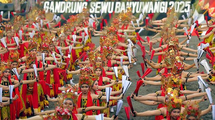 - Gandrung Sewu 2025 hadirkan 1.400 penari di Pantai Boom Banyuwangi, Jatim, dengan tema “Selendang Sang Gandrung”.