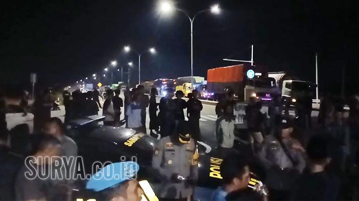 SURYA.CO.ID LAMONGAN - Warga Desa Balun, Kecamatan Turi Kabupaten Kabupaten Lamongan Jawa Timur menggelar demo memblokade perempatan Jalan Lingkar Utara (JLU) Balun - Sukorejo Minggu (14/9/2025) malam..