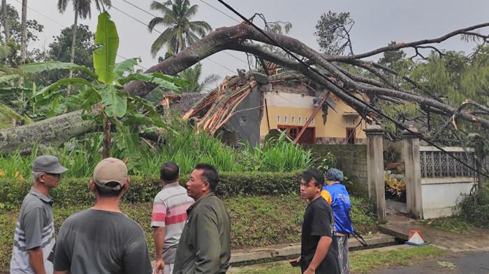 Salah satunya, pohon sengon ukuran diameter 2 meter roboh diterjang angin kencang dan menimpa rumah milik Busono (65) hingga bagian atap rumah Busono hancur total tertimpa pohon.