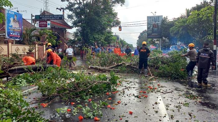 Hujan deras disertai angin kencang membuat sejumlah pohon tumbang di pinggir jalan Kota Blitar, Jatim, Rabu (1/10/2025).