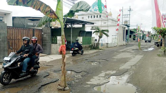 Warga Desa Ngunut Tulungagung Tanam Pohon Pisang di Tengah Jalan Raya yang Penuh Lubang