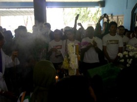 Kedatangan jenasah Janu diikuti ratusan suporter Persebaya (Bonek) dan pemain Bajul Ijo.